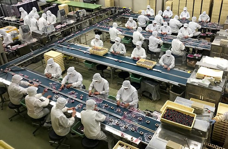 桔梗信玄餅詰め放題体験の後は製造ラインを見学!機械を使って効率よく行う作業だけでなく、スタッフの手によって行われる作業までガラス越しに見学いただけます。一つ一つ丁寧に結ばれる包みに込められた真心が伝わるはず!